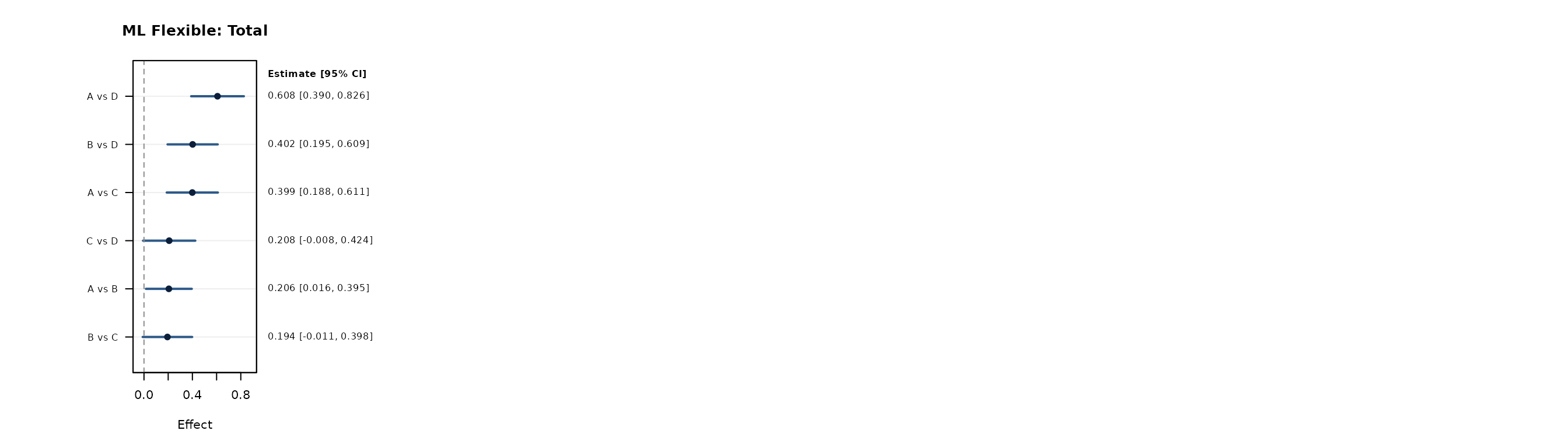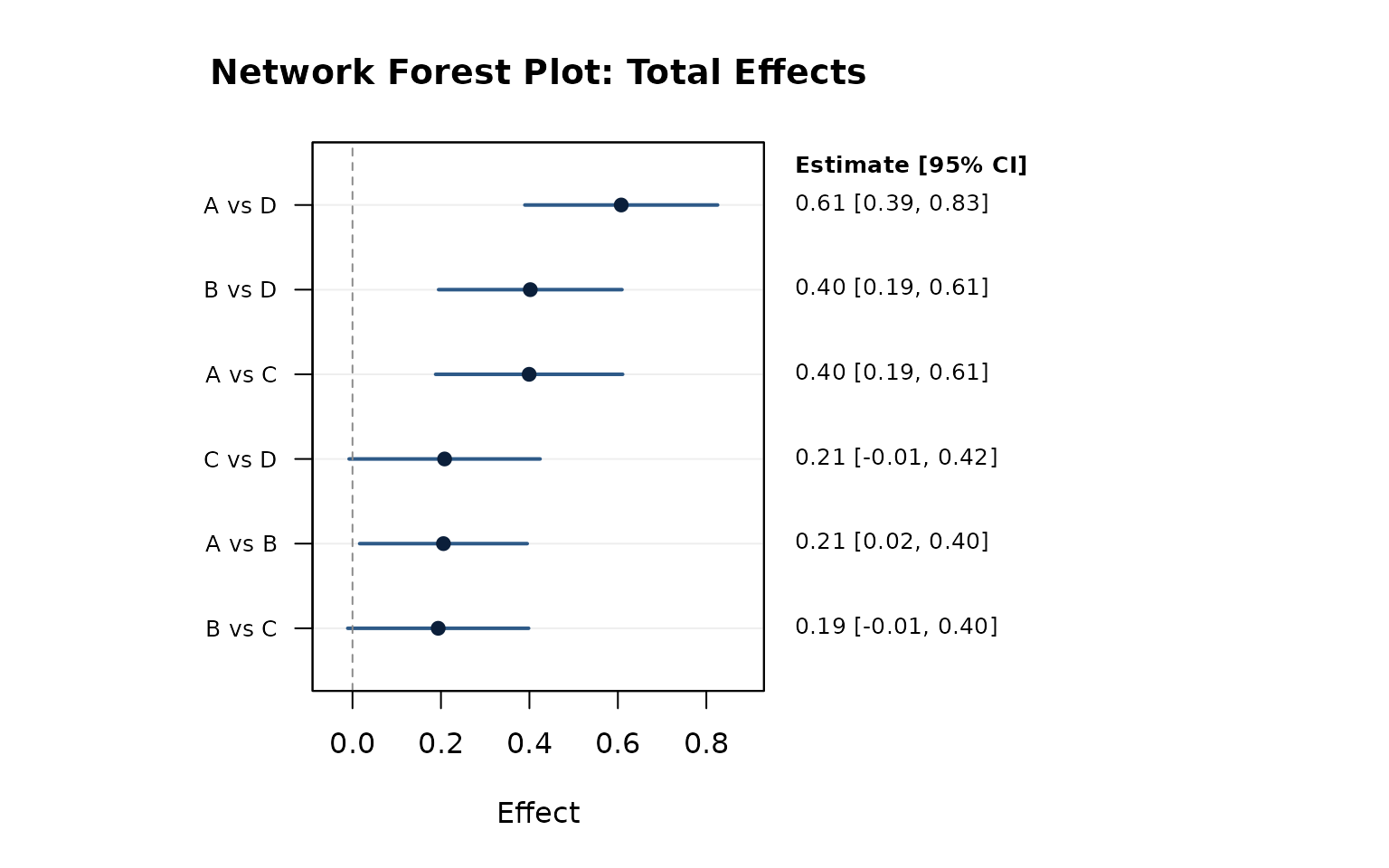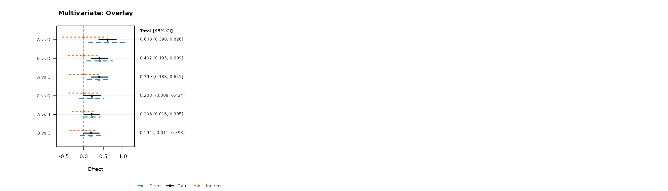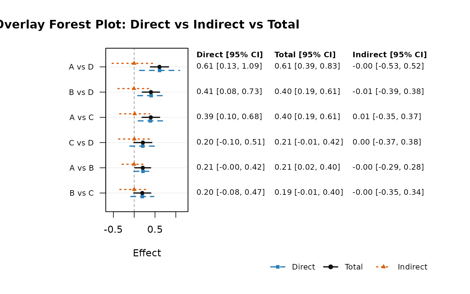 #> [1] "Indirect SEs are approximate; for mixed direct+indirect comparisons, var(indirect) is computed as var(total) + var(direct) assuming zero covariance."